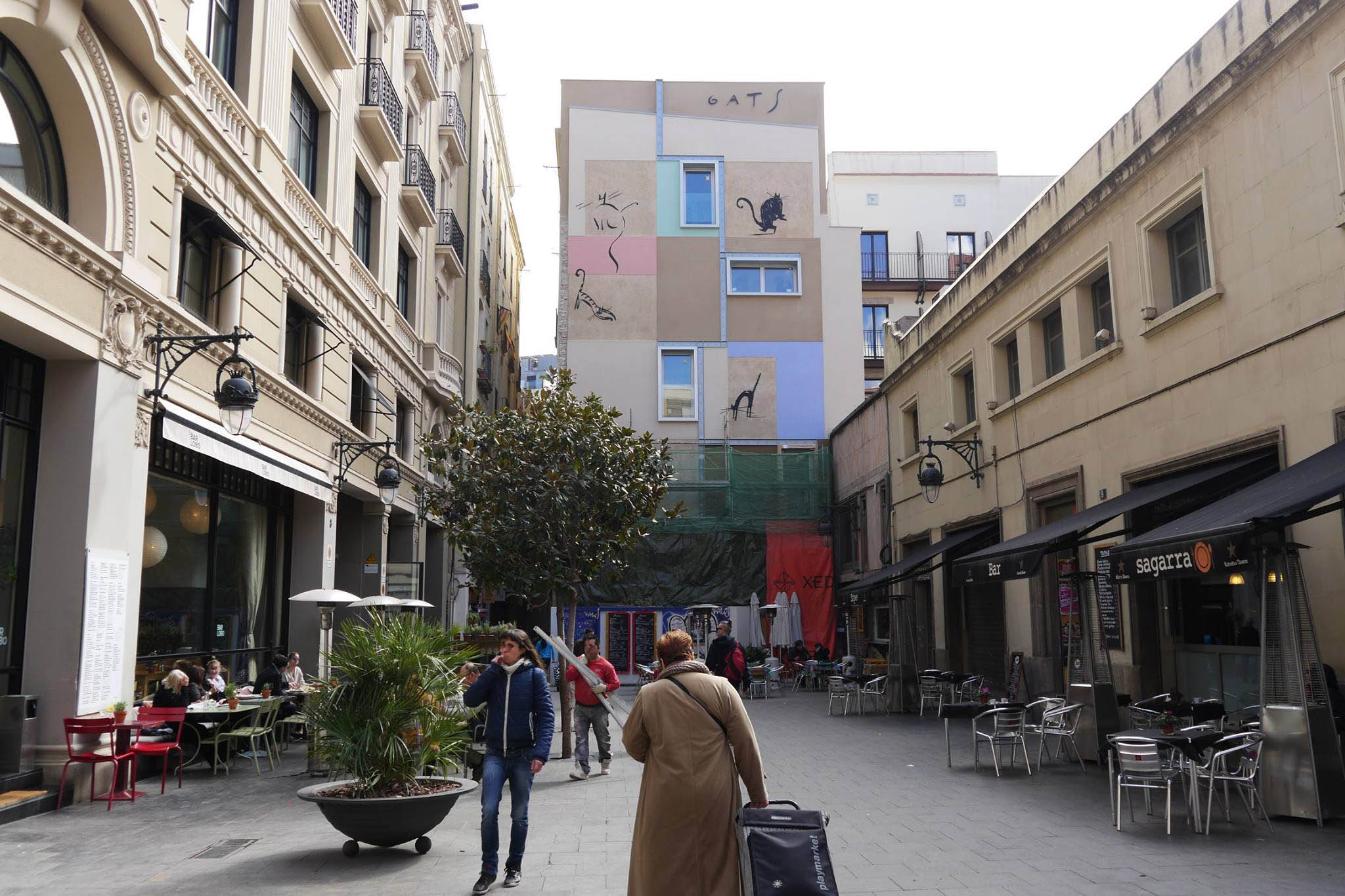 In April 1998, I did this wall painting on the crossroad between the streets Xuclà and Pintor Fortuny at the Barcelona neighborhood El Raval, a corner that now is commonly known as “Plaça dels Gats” (the cat square). This event took part of the project La Ciutat de les Paraules (the words city) promoted by a group of people linked to the MACBA, and supported by the city council. This project consisted in several ephemeral artistic interventions in deteriorated spaces of the neighborhood. However, some of them survived such as the cats of my wall, in this case saved by the city council at the request of the neighbors who had adopted them. The wall together with the cats have been restored twice, last time in March of 2015.